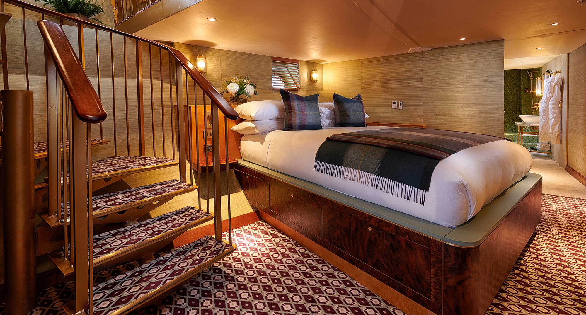 Sailing the wild seas to the most remote lighthouses located along the coast, Scotland is weaved into the tapestry of Fingal's history. Aboard, the details and small touches reflect our partnerships and the best that Scotland has to offer. Our cabins, with their luxurious décor, feature our exclusive tartan by weaver Araminta Campbell, telling Fingal Hotel's story. The heritage fabric reflects the purple heather of a Scottish mountain landscape, a bright light casting the warm glow of the lighthouse beam, guarding ships safely away from the rocky shores.