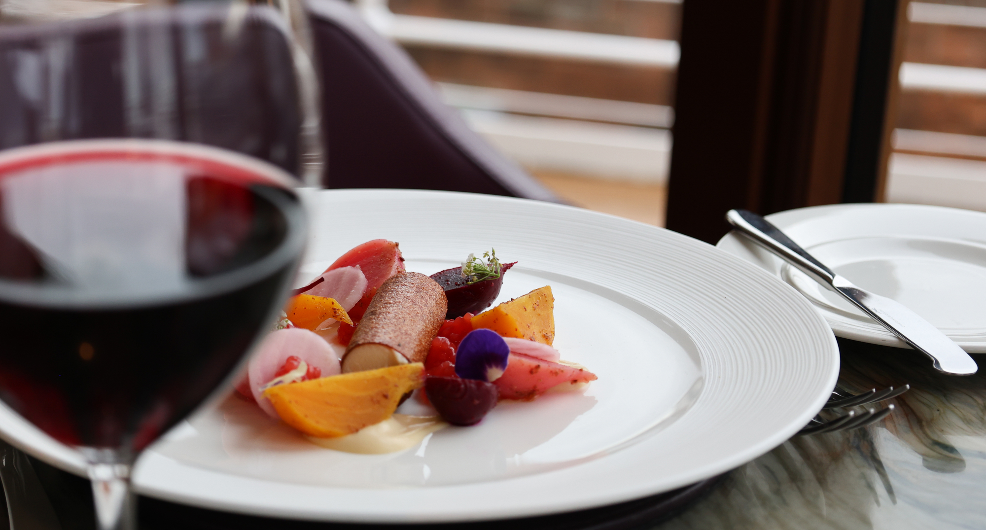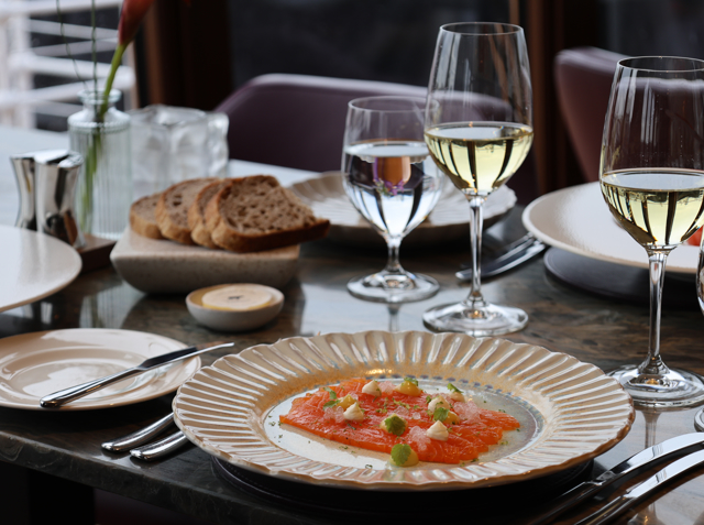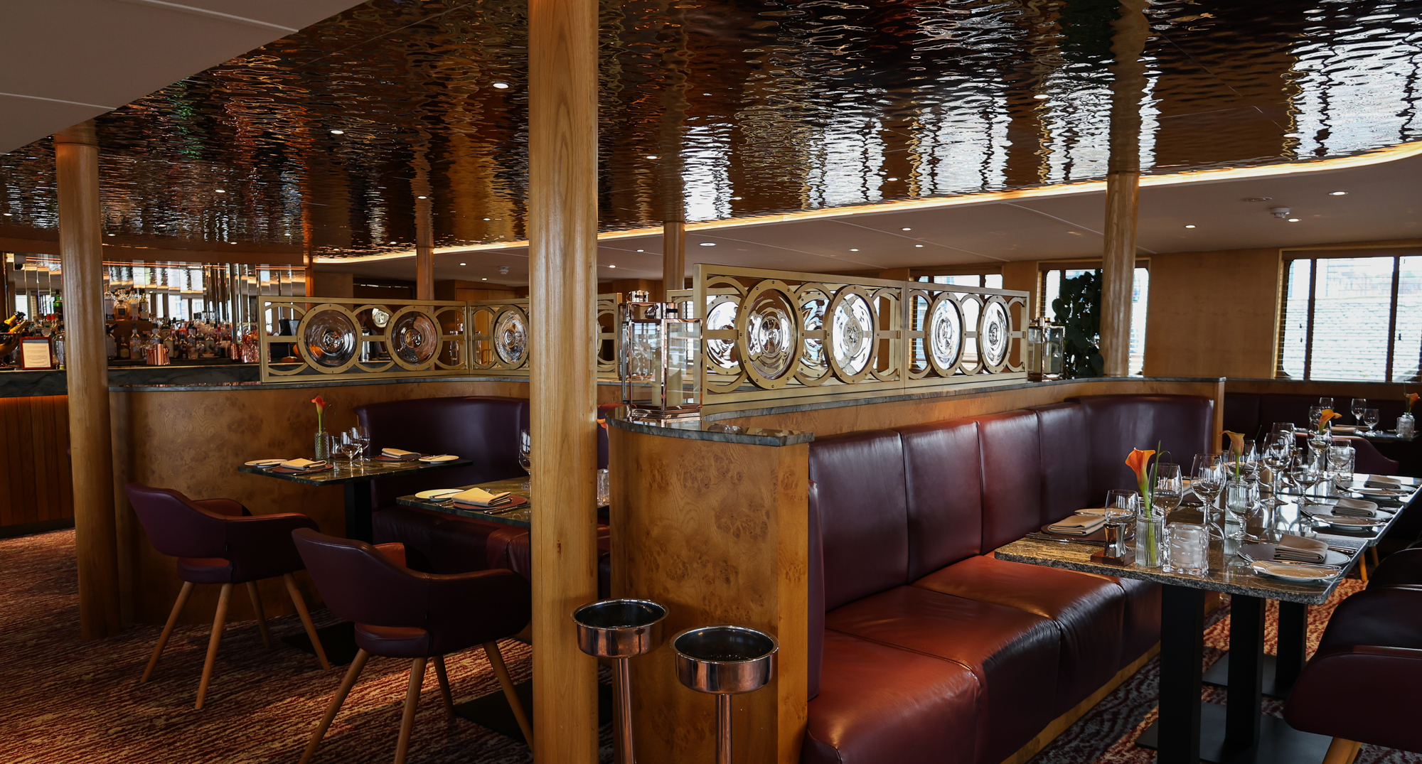 In the onboard restaurant, relax on seats covered in the softest leather and watch the vibrant Leith Docks transform from bold daylight into soft, dusky tones, as the evening sun spills across the ocean.