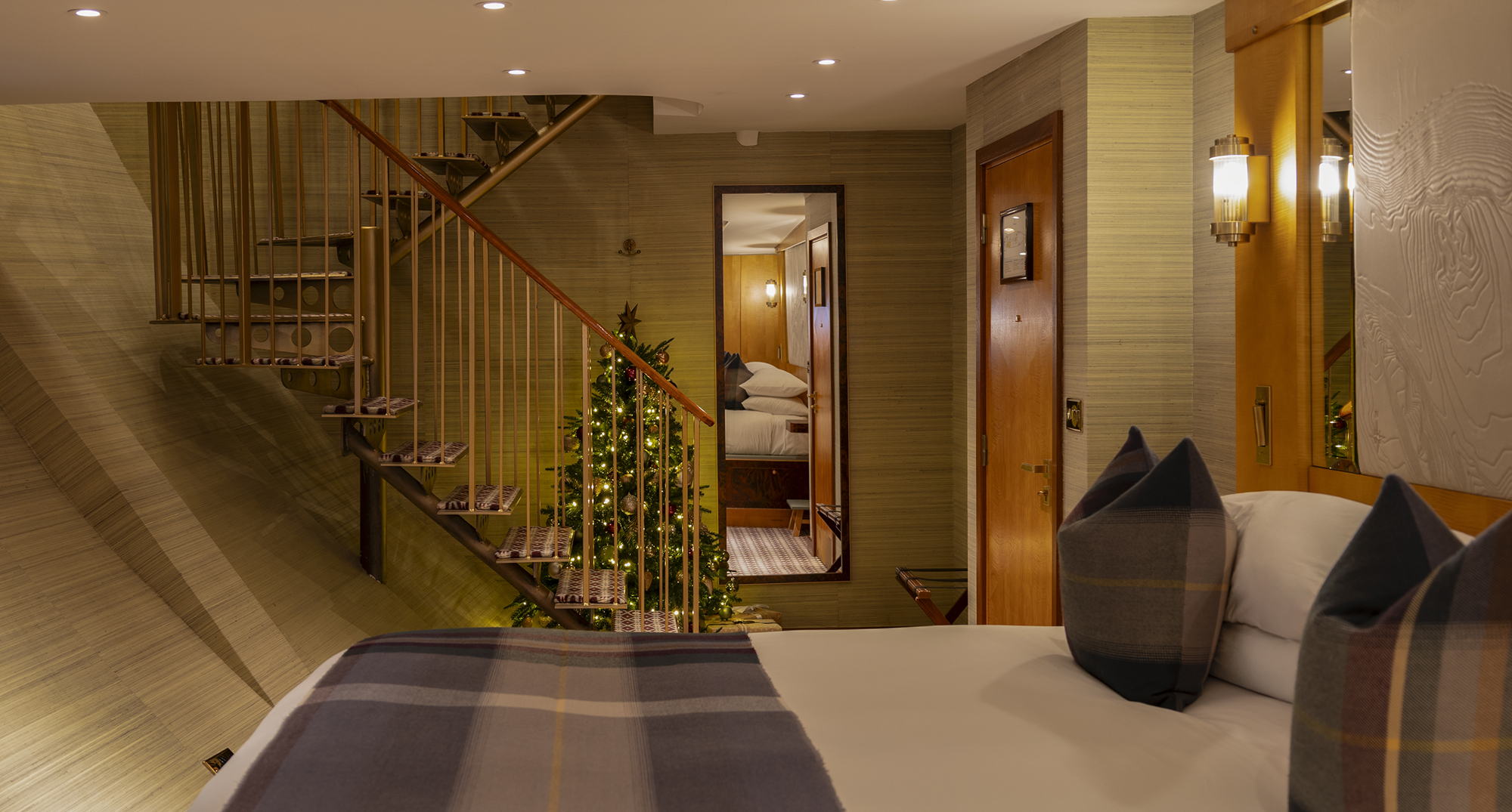 Walk into your upstairs living space, comfy armchairs fitting into the Ship’s unique curves.